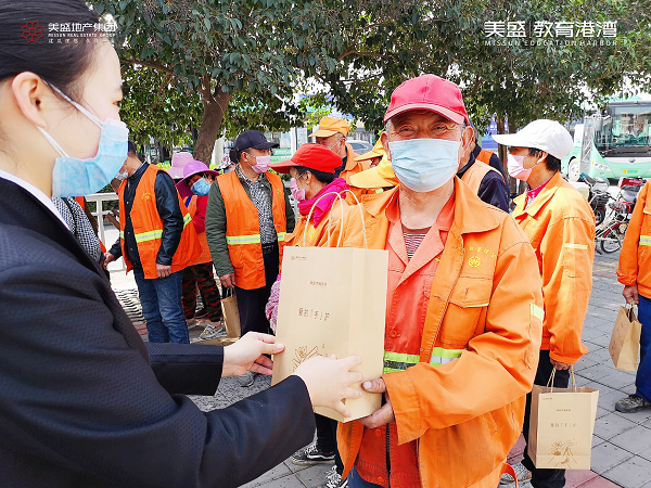 心懷感恩之情,3月20日,美盛教育港灣團隊走到街頭一線,慰問那些堅守崗位一線的環衛工作者,為守護他們的健康送上一份防疫大禮包。