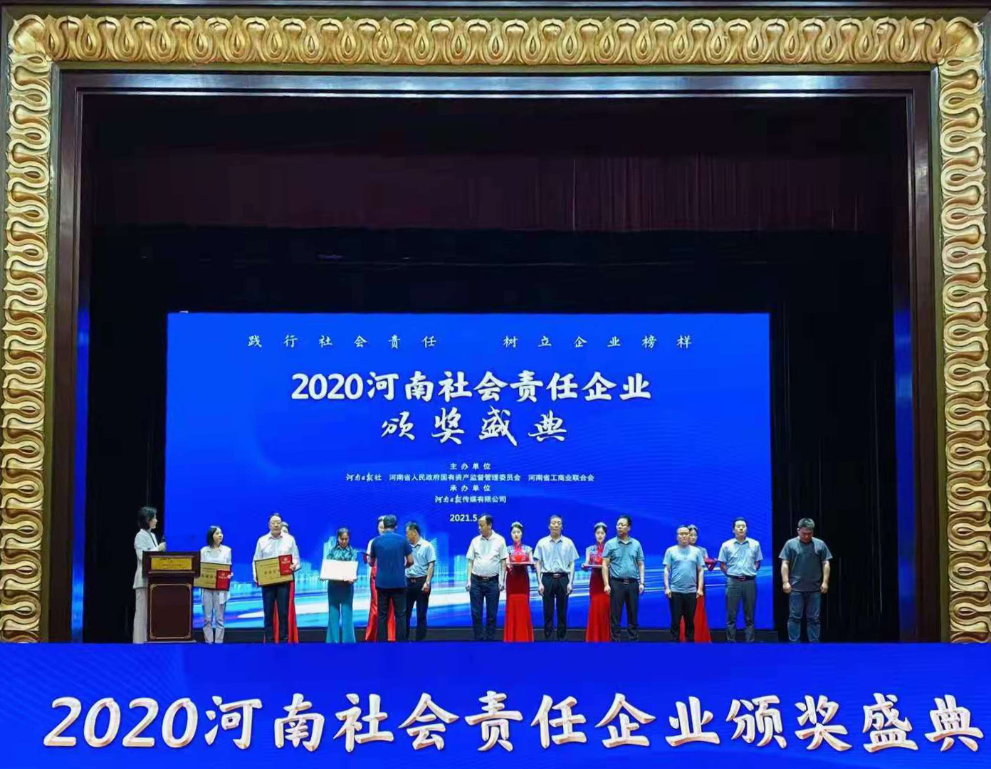 2021年5月21日,由河南日報社、河南省國資委、河南省工商業聯合會聯合主辦,河南日報傳媒有限公司承辦的“2020河南社會責任企業”推選活動頒獎典禮在鄭州黃河迎賓館隆重舉行。