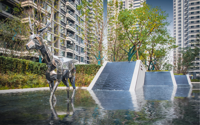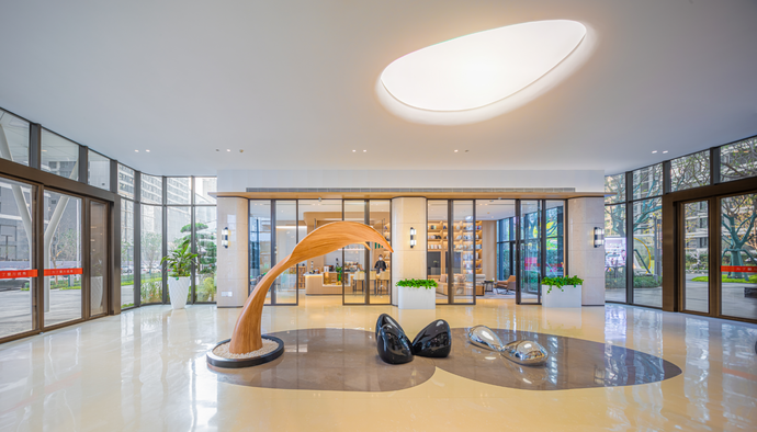 穿過歸家大堂,映入眼中的是大面積疊水瀑布景觀,飛花濺玉,水聲淙淙,錦鯉歡游;水系周圍,造型烏桕樹陣姿態(tài)遒勁,建筑與綠樹的倒影隨水波而流動,盡顯活力與生機(jī)。