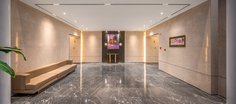首層單元入戶大堂,同樣以高規(guī)格現(xiàn)代風(fēng)格進(jìn)行精裝,落地玻璃單元大門搭配金屬細(xì)節(jié),呈現(xiàn)明亮、清雅的空間感,大堂空間全鋪設(shè)石材、以藝術(shù)畫裝點(diǎn),綠植、休息沙發(fā)等也已就位,帶給居者舒適的視覺享受和品質(zhì)體驗(yàn)。