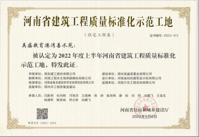 2022年4月,美盛金水印工藝博物館、實景地庫品質呈現;全年實現7棟樓封頂,榮獲河南省建筑工程質量標準化示范工地;